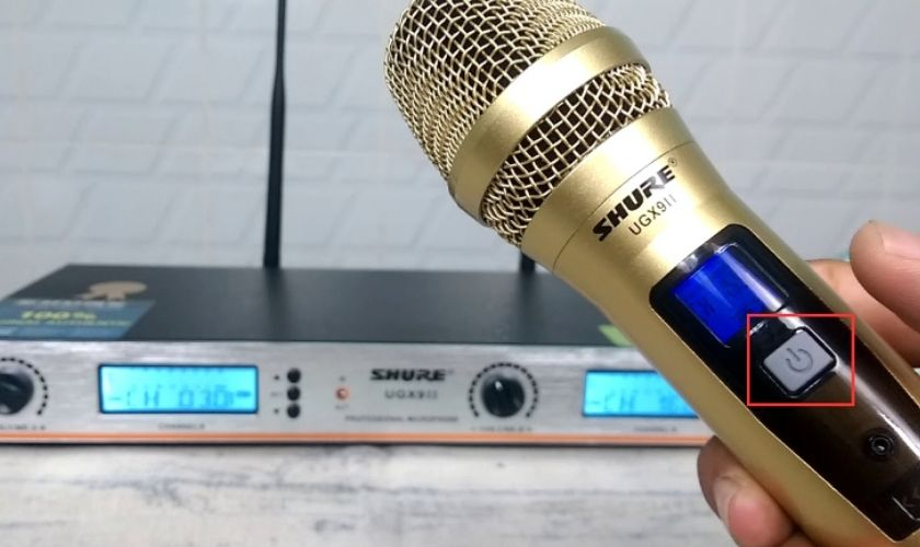 Bước 1: Bấm nút Power trên micro để mở thiết bị. Khi đèn sáng nghĩa là micro đã hoạt động.