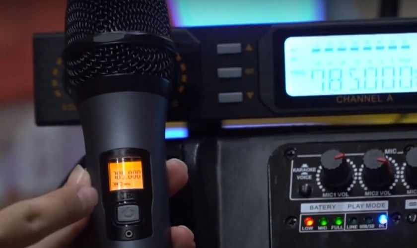 Bước 3: Khi cả loa và micro đã bật, hai thiết bị sẽ tự dò tần số để kết nối. Bạn sẽ nhận biết micro đã ghép đôi nhờ âm báo hoặc khi tần số hiển thị trên màn hình loa trùng với tần số của micro.