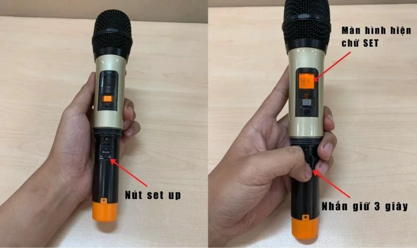 Bước 2: Tiến hành đặt lại tần số của micro để tránh trùng sóng với những thiết bị đã kết nối trước đó. Bạn chỉ cần giữ nút Set khoảng năm giây cho đến khi đèn trên micro chuyển sang màu đỏ.