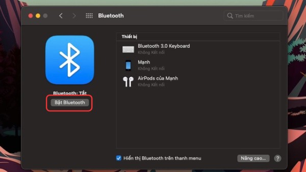 – Bluetooth chưa bật hoặc lỗi tạm thời: Vào System Preferences → Bluetooth, chọn Turn Off, sau đó bật lại Turn On.