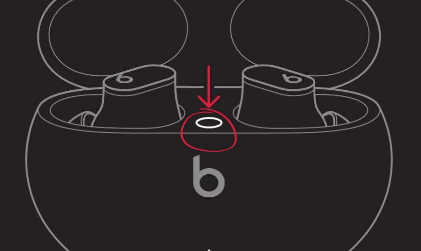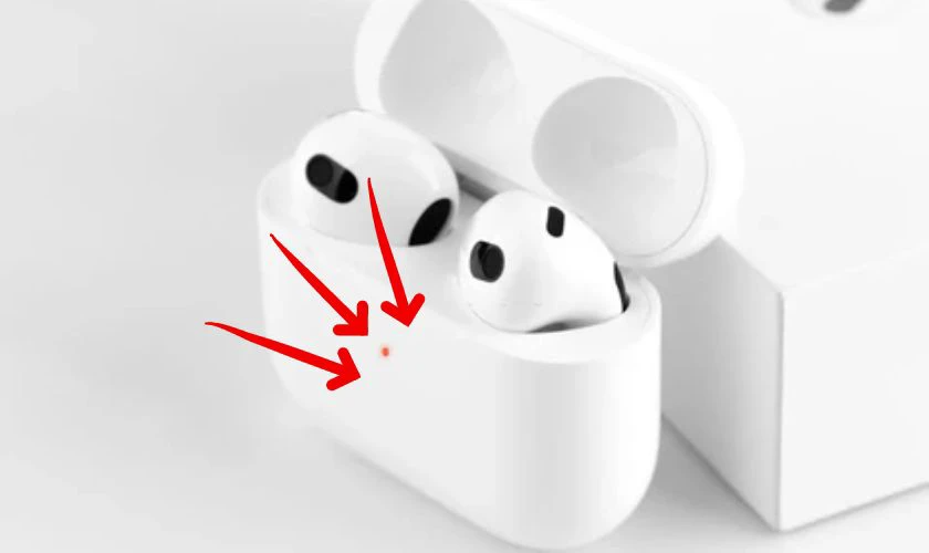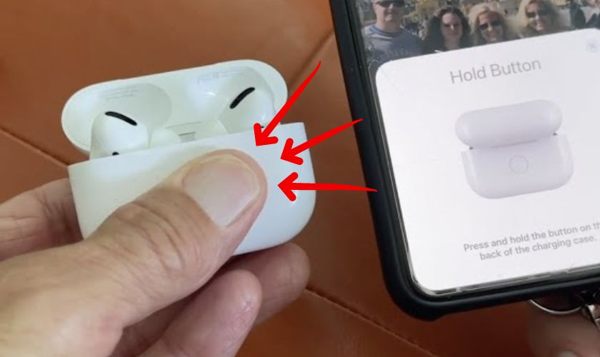 Bước 2: Tìm nút tròn nhỏ phía sau hộp sạc, nhấn và giữ khoảng 15 giây. Ban đầu đèn sẽ sáng trắng, sau đó chuyển sang màu vàng nhấp nháy ba lần rồi quay lại màu trắng. Khi đó, bạn có thể thả tay ra – reset hoàn tất.