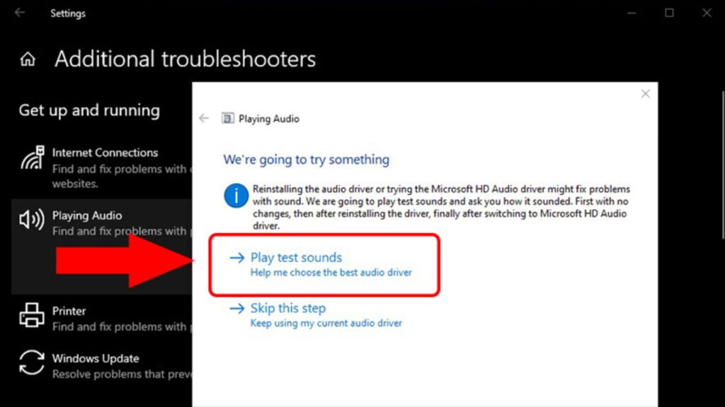 Nếu bạn không nghe thấy âm thanh kiểm tra, hãy chọn “I didn’t hear anything”, hệ thống sẽ tự động chẩn đoán và sửa lỗi cho bạn. Quá trình này thường mất vài phút và giúp khôi phục cấu hình âm thanh gốc.