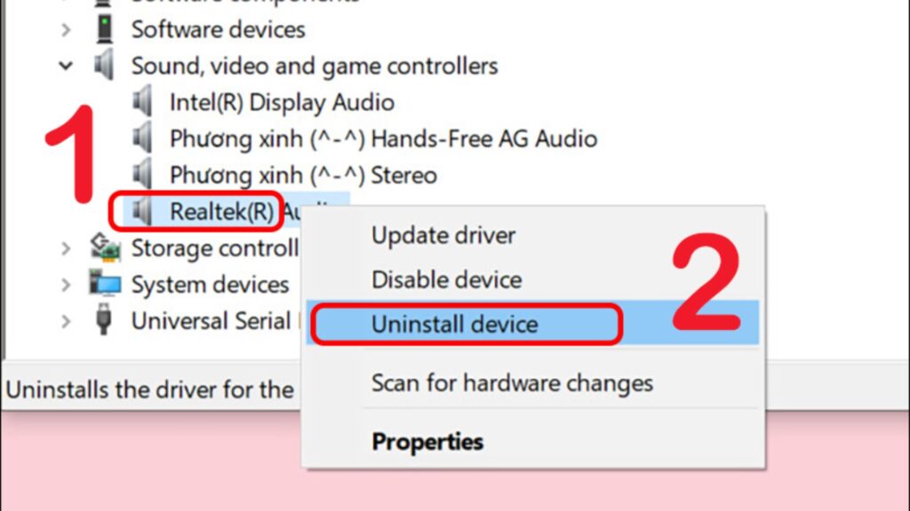 - Click chuột phải vào thiết bị tương ứng (ví dụ: Intel Bluetooth Adapter hoặc Realtek Audio) → chọn Uninstall device.