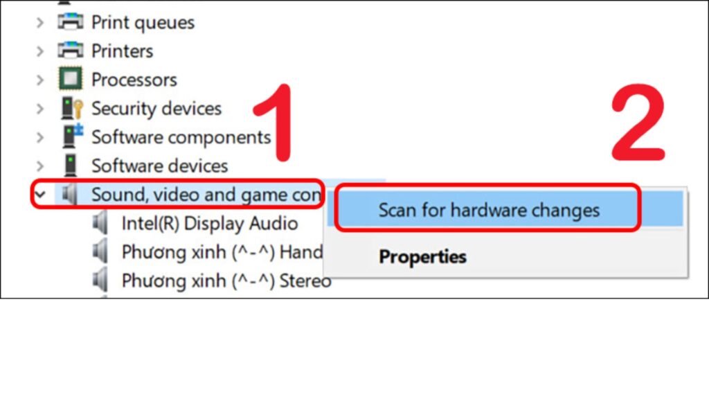 - Sau đó, nhấn chuột phải vào phần danh mục đó → chọn Scan for hardware changes. Windows sẽ tự động cài lại trình điều khiển mới cho thiết bị.