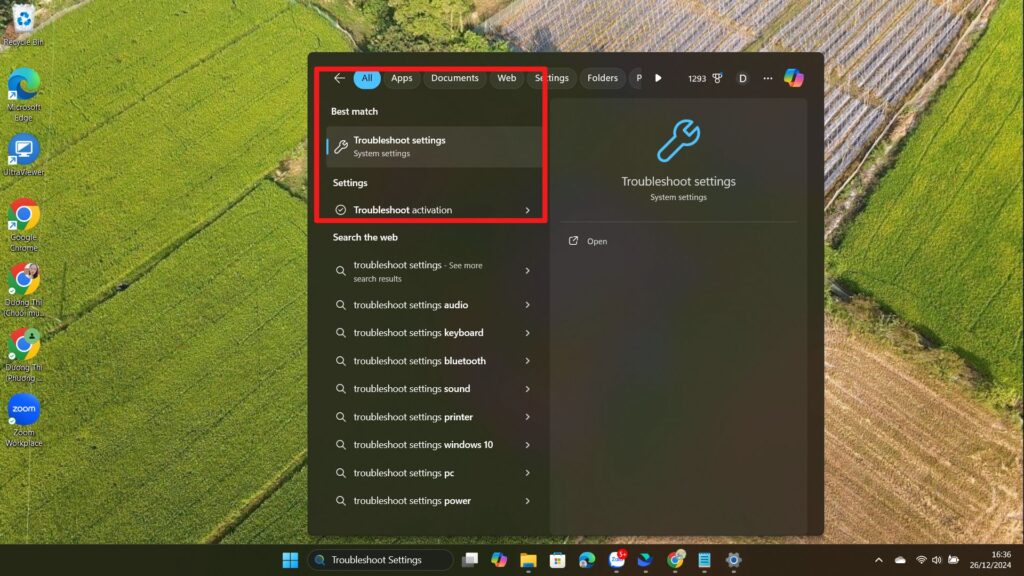 - Tại thanh tìm kiếm Windows, gõ “Troubleshoot Settings” và mở.